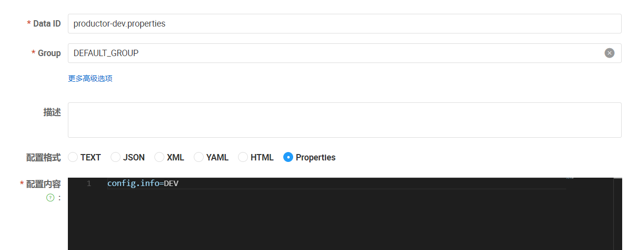 #注冊(cè)中心地址 spring.cloud.nacos.config.server-addr=localhost:8848 #與配置中心DataID的prefix一致 spring.cloud.nacos.config.prefix=productor ##與配置中心DataID的file-exetension一致 spring.cloud.nacos.config.file-extension=properties #與配置中心DataID的spring.profiles.active一致 spring.profiles.active=dev