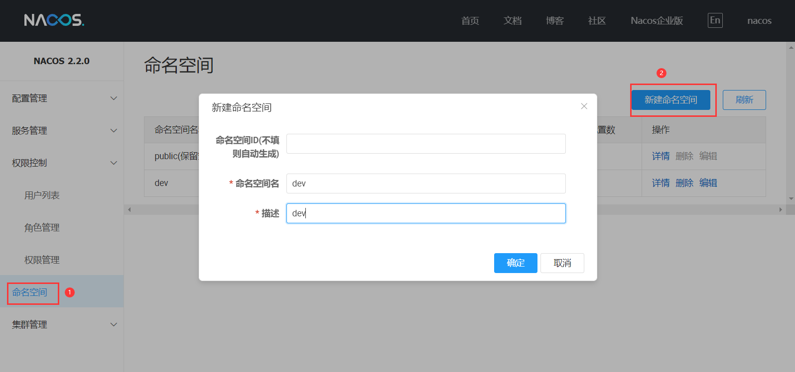 在Nacos頁(yè)面點(diǎn)擊命名空間,點(diǎn)擊創(chuàng)建命名空間