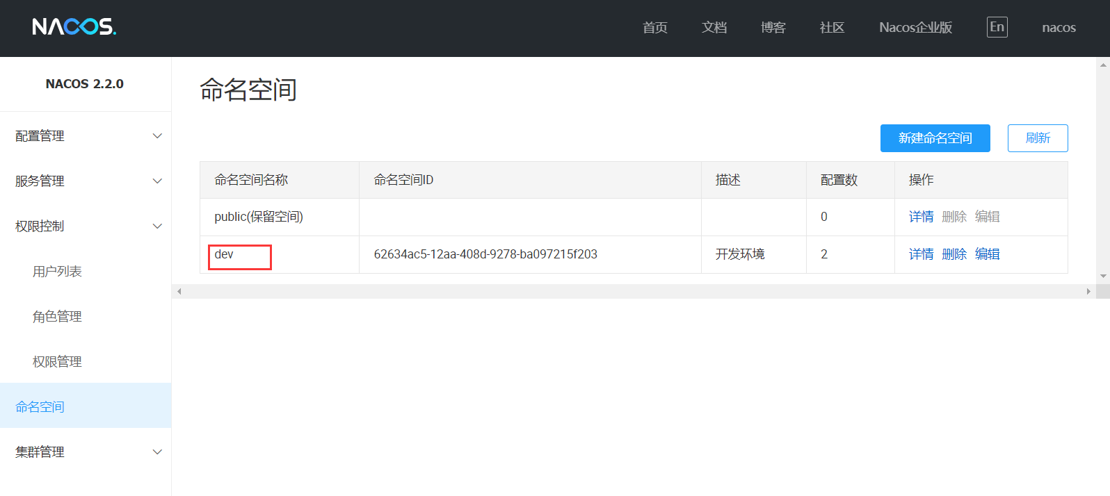spring.profiles.active=test spring.cloud.nacos.config.namespace=5f8d56ea-111b-46e6-9edb-68bf92b9706b