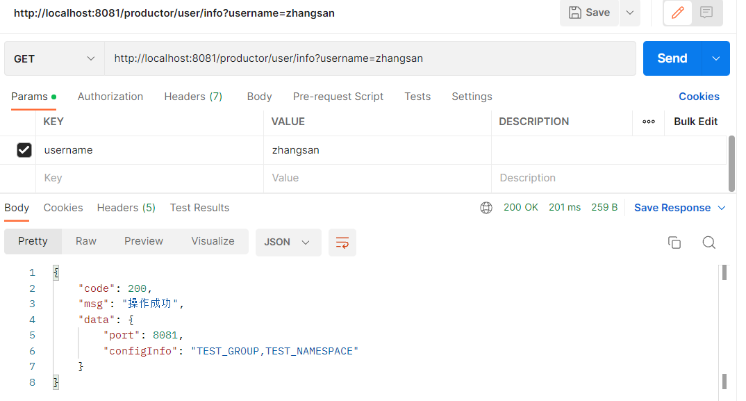 啟動(dòng)springboot項(xiàng)目,使用postman通過(guò)消費(fèi)者遠(yuǎn)程訪問(wèn)接口,可以成功返回結(jié)果: