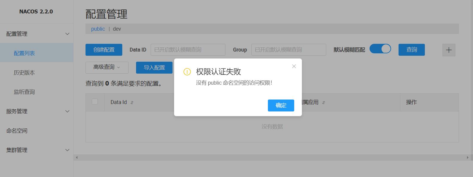 當(dāng)訪問(wèn)配置列表和服務(wù)列表的public時(shí),提示權(quán)限認(rèn)證失敗,此時(shí)配置列表中public命名空間的配置文件不能進(jìn)行讀寫(xiě)。