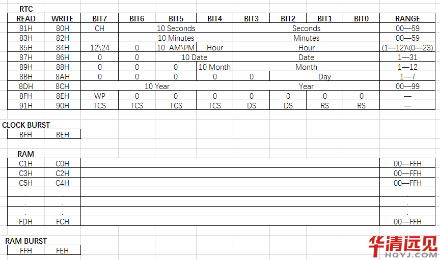 由時鐘/日歷命令字來指定突發模式操作。在這種模式下,8個時鐘/日歷寄存器可以被連續的讀出或者寫入。讀出或者寫入的其實位置是0地址的第0個bit位。