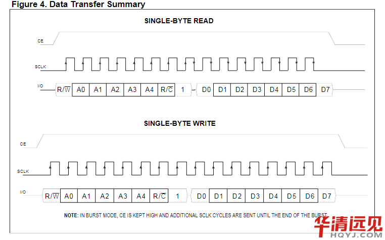 由RAM命令字來指定突發模式操作。在這種模式下,31個RAM寄存器可以被聯系的讀出或者寫入。讀出或者寫入的其實位置是0地址的第0個bit位。