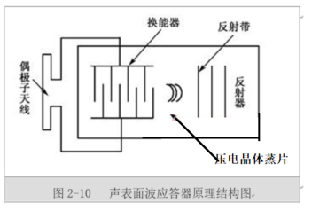 聲表面波應(yīng)答器的基本結(jié)構(gòu)如圖2-10所示,長長的一條壓電晶體基片的端部有指狀電極結(jié)構(gòu);ǔ2捎檬⑩壦徜嚮蜚g酸鋰等壓電材料制作,指狀電極電聲轉(zhuǎn)換器(換能器)。在壓電基片的導(dǎo)電板上附有偶極子天線,其工作頻率和讀寫器的發(fā)送頻率一致。在應(yīng)答器的剩余長度安裝了反射器,反射器的反射帶通常由鋁制成。