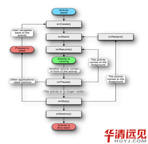 onResume : 當此方法回調時,則說明Activity已在前臺可見,可與用戶交互了(處于前面所說的Active/Running形態),onResume方法與onStart的相同點是兩者都表示Activity可見,只不過onStart回調時Activity還是后臺無法與用戶交互,而onResume則已顯示在前臺,可與用戶交互。當然從流程圖,我們也可以看出當Activity停止后(onPause方法和onStop方法被調用),重新回到前臺時也會調用onResume方法,因此我們也可以在onResume方法中初始化一些資源,比如重新初始化在onPause或者onStop方法中釋放的資源。
