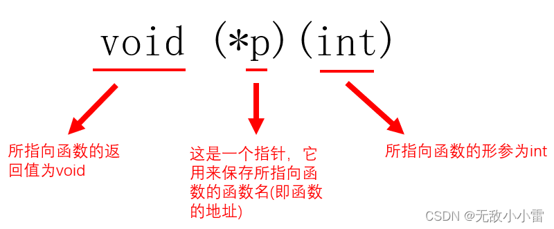 void (*p)(int)實際上就是,void (*)(int) p(定義了一個指針,其中void (*)(int)為指針類型,p為指針),例如:void (*)(int) p = test;其中p就表示為一個指向函數test()的函數指針。前面我們說過,指針實際上就是地址,也就是說void (*)(int) p是一個用來保存函數text函數首地址的指針(即用來保存test函數名字)。但是void (*)(int) p這種格式,C語言標準不認可,我們需要寫成void (*p)(int)這種格式。