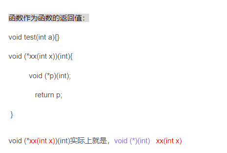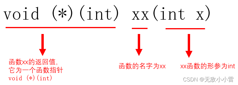 xx(int x)是一個函數,其返回值為void(*)(int)函數指針類型,即其返回值是一個指向其他函數的指針。注意:xx(int x)是一個函數,而不是一個用來保存地址的指針,所以此時void (*)(int)就為函數的返回值,而不是指針的指針類型。