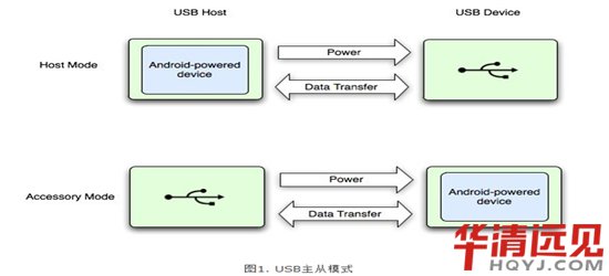 圖1展示了兩種模式的異同。當Android設備處于主機模式時,它扮演USB主機角色并為總線供電。當Android設備處于附件模式時,被連接的USB硬件(在這種情況下是一個Android USB附件)扮演主機角色并給總線供電。
