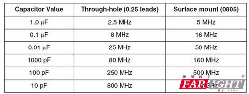 表1 列舉了兩種類型陶瓷電容的諧振頻率,一種是標準的0.25 inch 的插件電容, 3.75n H 的內(nèi)部電感系數(shù), 另外一種是貼片電容, 內(nèi)部感應(yīng)系數(shù)是1n H, 我們可以從表中看到貼片電容的諧振頻率是插件電容的兩倍左右.