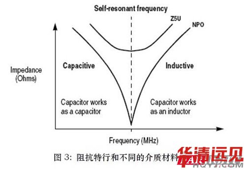 在諧振頻率之前, 電容還保持著電容的特性, 而大于諧振頻率時,由于引線長度和導(dǎo)線電感的影響, 電容的作用將變成電感的作用.