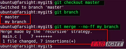 操作效果如下,合并之后有相應的提示, --no-ff參數表示可以用普通模式合并,合并后的歷史有分支,能看出來曾經做過合并,而fast forward合并就看不出來曾經做過合并。