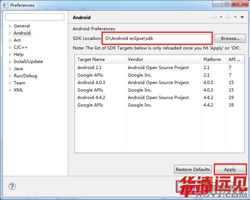 需要為Eclipse關聯SDK的安裝路徑,即解壓路徑下的sdk目錄。在Eclipse中,點擊Window->Preferences,會看到其中添加了Android的配置,按圖所示的操作,然后點擊Apply,后點擊OK即可。