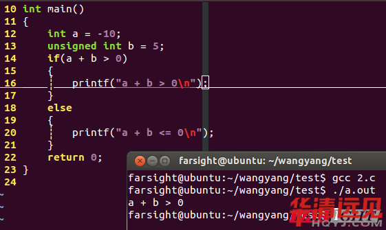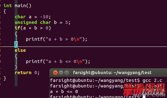 打印的結(jié)果為a + b <= 0,結(jié)合圖2-3,我們可以推斷出char類型與unsigned char在進行運算時,都轉(zhuǎn)換成了int類型,同樣,如果將char改成short,unsigned char改成unsigned short,結(jié)果也是a + b <= 0,那就說明了short與unsigned short在進行運算時,也都轉(zhuǎn)換成了int。