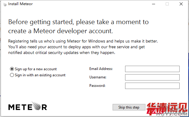 如果在安裝過程中發生任何錯誤,可以嘗試以管理員身份運行安裝程序。當安裝完成后,它會要求你創建 Meteor 帳戶。