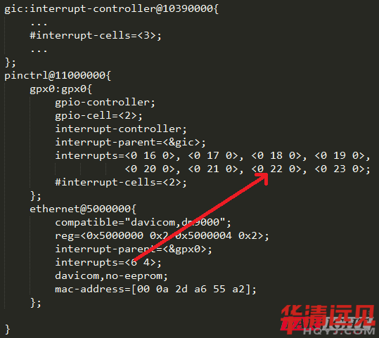 比如:父節(jié)點的#interrupt-cells的值是3,則子節(jié)點的interrupts一個cell有三個32bits整型值,<中斷域 中斷 觸發(fā)方式>