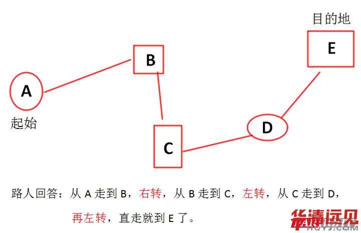 在我理解而言,這其實就是在遍歷樹形結構時,用的一種方法,即指路法。每當我們在某個陌生的地方問路時,假設從A地到E地,情景通常如下: