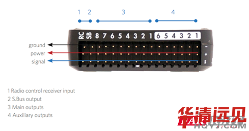 3. 主輸出,8 個PWM 通道,用于連接電調或者舵機。