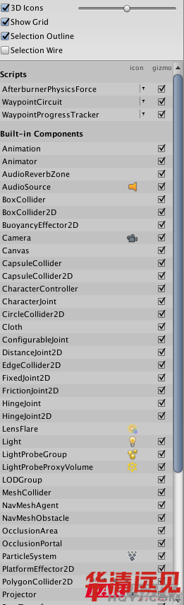 下圖中,Unity開發(fā)環(huán)境中的Gizmos按鈕所涉及到的基于Gizmos類的繪制射線,線段,網(wǎng)格球體,實體球體,網(wǎng)格立方體,實體立方體,圖標(biāo),GUI紋 理,以及攝像機(jī)線框。但有些特殊的場景視圖,用戶只能夠自己編碼實現(xiàn)定制化的Gizmos類實例。