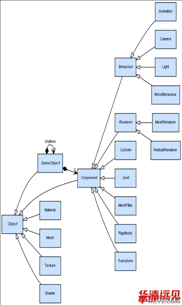 所有類的抽象基類Object,游戲場景中所放置的所有游戲?qū)ο蠼詮拇祟惱^承而來,有點類似于蘋果系統(tǒng)中的NSObject (面向?qū)ο驝的基類)。Unity開發(fā) 工程中涉及用到的動畫、攝像機(jī)、燈光、腳本行為、粒子渲染、碰撞器、剛體、變換、材料、網(wǎng)格、著色器和渲染器等等均按照類的繼承和組合關(guān)系 實現(xiàn)的。