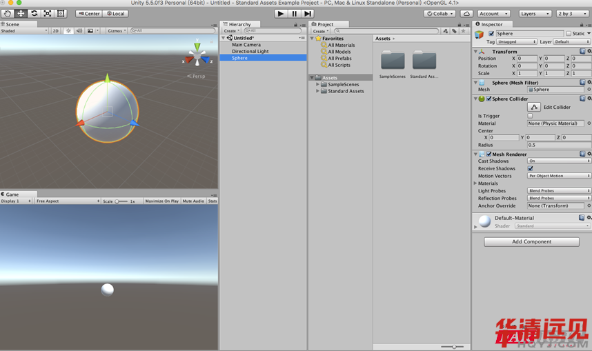 透過上面的分析,我們能夠看到Unity環(huán)境很好滴沿用了現(xiàn)代編程語言的交互式開發(fā)模式和體驗,只需用戶將需要的物體放入場景(如圖中放入一個球 體),Hierarchy選項卡就可以實時看到物體的諸多屬性;反過來用戶修改某個屬性信息又可以在場景環(huán)境中實時地看到變化。而且,在游戲(Game) 選項卡中用戶能夠預(yù)覽到運行時的場景變化。