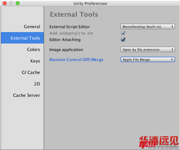比如外部工具選擇的腳本編譯器選項,在Mac系統(tǒng)環(huán)境下,可以選擇MonoDevelop或者Xamarin Studio兩種開發(fā)工具,相應(yīng)地Windows系統(tǒng)環(huán)境下,可以 選擇MonoDevelop或者Visual Studio兩種IDE開發(fā)環(huán)境。這種設(shè)計思路往往在很多的可視化工具設(shè)計環(huán)境當(dāng)中,我們能夠找到很好的例子。另外,這里 展現(xiàn)的Unity環(huán)境一個不同于其它環(huán)境的特點就是考慮了設(shè)計工具的協(xié)同工作,直接和其它現(xiàn)成的優(yōu)秀開發(fā)工具一道為項目開發(fā)更好地服務(wù)。