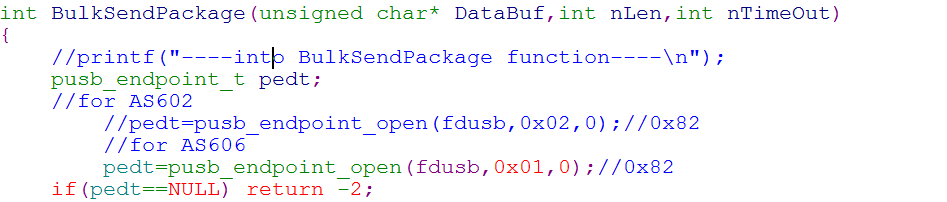 在文件系統(tǒng)支持上卡了很長時間,底層文件系統(tǒng)支持加不上就會導(dǎo)致Open usb fail,設(shè)備就無法打開,但是AS606模塊給我們提供了三種打開方式,分別是USB,UDISK和COM,我們試用的內(nèi)核雖然不支持usbfs文件系統(tǒng)導(dǎo)致usb設(shè)備無法打開,但是可以支持UDISK設(shè)備的,所以我們依舊可以使用USB接口去打開指紋模塊,將原廠提供的demo交叉編譯后拷貝到開發(fā)板直接運(yùn)行就可打開UDISK設(shè)備,但是調(diào)試程序無法執(zhí)行,需要修改SYDevice.cpp文件里BulkSendPackage函數(shù)中的一個參數(shù),如下圖: