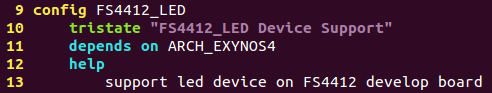 如果FS4412_LED Device Support選項被選中為*,則保存配置之后會在源碼目錄下面的.config文件中出現(xiàn)CONFIG_FS4412_LED的配置項并賦值為y;這個.config文件就是配置內(nèi)核后生成的保存配置信息的文件。