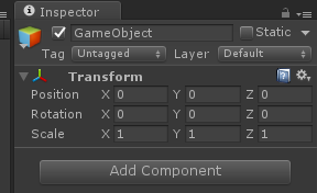 現在Unity中創建一個Empty GameObject ,選中我們新建的GameObject,在Inspector視圖中我們看到如圖的組件 默認帶了一個Transform組件。