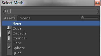 和上述步驟一樣,Add Component,選擇Mesh Renderer,返回到Scene中看到會有如此場景,選擇上面所說的不同Mesh,可以看到Scene中呈現出不同的形狀。
