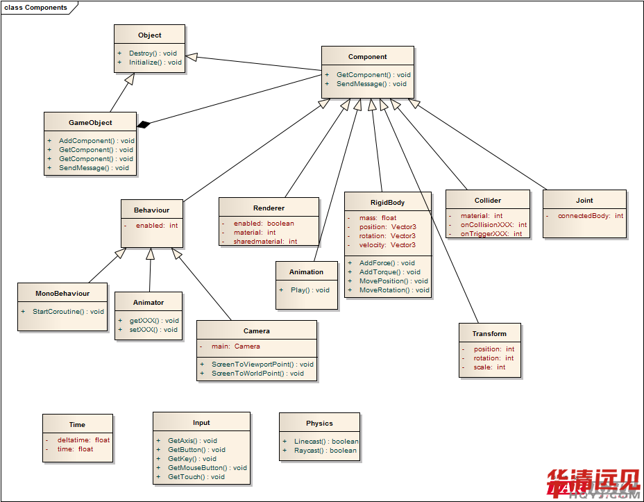 由上圖可以看出Unity中的所有類都繼承于Object,而Unity中只分了兩個種類,一個是GameObject和一個Component,而Component的派生類包含了Unity中所有類,Unity3D面向組件編程的思想略見一斑。