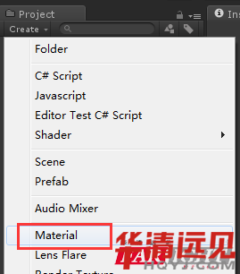 在Unity中,GameObject呈現出這種顏色,一般都是材質的缺失。現在新建一個材質球(Material)在Project視圖中點擊Create選擇Material,然后把New Material拖拽給GameObject,場景顯示如圖