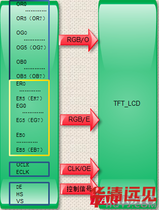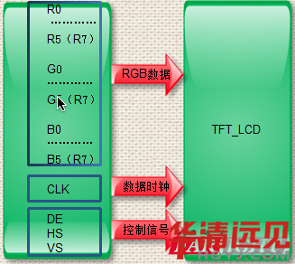 對(duì)于8bit單路TTI,輸出接口,共有24條RGB數(shù)據(jù)線,分別是R0~R7紅基色數(shù)據(jù)8條,B0~B7綠基色數(shù)據(jù)8條,BO~B7藍(lán)基色數(shù)據(jù)8條,共3*8=24條。由于基色RGB數(shù)據(jù)為24bit,因此,也稱(chēng)24位或24bitTTL接口。