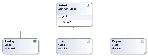 由于不同的動物吃不同的食物,所以在Animal類中定義一個抽象方法:eat();有子類負責實現。