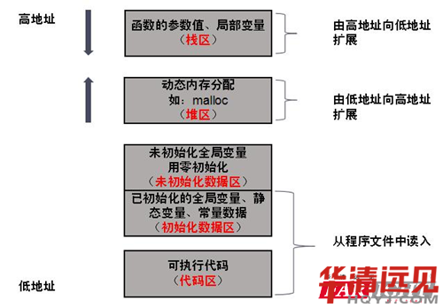 如圖所示:C程序中,棧區主要存儲函數的參數,局部變量等,并且棧底為高地址,棧頂為低地址(如圖:由高地址向低地址擴展)。