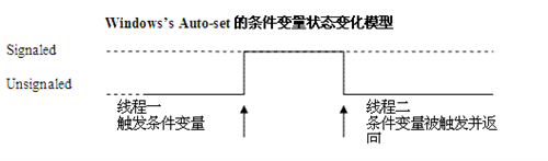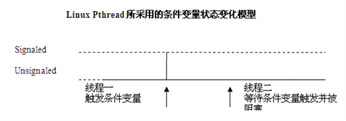 具體來說,Linux 平臺上 Pthread 下的條件變量狀態變化模型是這樣工作的:調用 pthread_cond_signal() 釋放被條件阻塞的線程時,無論存不存在被阻塞的線程,條件都將被重新復位,下一個被條件阻塞的線程將不受影響。而對于 Windows,當調用 SetEvent 觸發 Auto-reset 的 Event 條件時,如果沒有被條件阻塞的線程,那么條件將維持在觸發狀態,直到有新的線程被條件阻塞并被釋放為止。