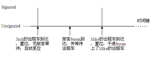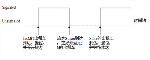 通過對比結果,你會發現同樣的邏輯,在 Linux 平臺上運行的結果卻完全是兩樣。對于在 Windows 平臺上的模型一, Jack 開著出租車到了站臺,觸發條件變量。如果沒顧客,條件變量將維持觸發狀態,也就是說 Jack 停下車在那里等著。直到 Susan 小姐來了站臺,執行等待條件來找出租車。 Susan 搭上 Jack 的出租車離開,同時條件變量被自動復位。