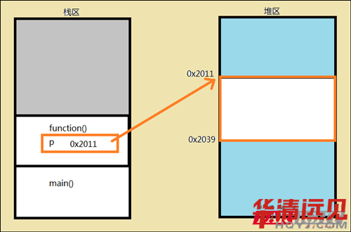 這是C語言開發學習過程中,必不可免要學習的知識,動態分配一塊空間,空間在堆區大小是40字節(32位系統中)。而定義的指針變量p是局部變量(在棧區中 占用4字節空間),用來存放剛剛前面動態分配的空間的首地址?梢钥闯觯谶@一句代碼中同時包含了棧和堆,如圖1所示。