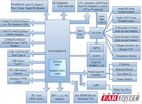 一.AT91SAM9261 SOC簡介 AT91SAM9261是atmel公司生產的以ARM926EJ-S ARM Thumb處理器為核心的完全片上系統(SOC),它擴展了DSP指令集和Jazelle Java加速器。主時鐘頻率190MHz時性能高達210MIPS。 AT91SAM926是一個為帶LCD顯示應用而優化了的主機處理器。它的集成LCD控制器支持BW而且達到16M色彩,主動和被動LCD顯示。16K字節的片上SRAM可配置為幀緩沖,能將LCD刷新對整體處理器性能上的影響降低到小。外部總線接口包括支持同步DRAM(SDRAM)和支持靜態存儲器的控制器,并有特殊接口電路以支持CompactFLASH和NandFLASH。 AT91SAM9261集成了一個支持映射的基于ROM的Bootloader,例如從外部DataFlash映射到外部SDRAM。由軟件控制的功率管理控制器(PMC)通過有選擇的啟用和關閉處理器、各種外設以及對工作頻率的調節使得系統功率損耗保持低。 AT91SAM9261還集成了寬范圍的調試特性。包括JTAG-ICE,一個專用的UART調試通道(DBUG)和嵌入式實時追蹤。這使所有應用和開發,特別是嚴格要求實時性的應用得以實現。下面是AT91SAM9261的功能框圖: