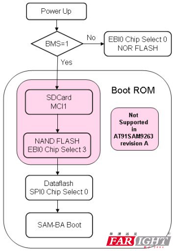 AT91SAM9261芯片的內部ROM中固化了一段啟動代碼,如果BMS引腳電平為1,則執行這段啟動代碼。啟動代碼會檢測和芯片連接的外部的各個存儲媒介(SPI DATAFLASH, NAND FLASH or SDCARD)上是否有有效的應用程序,如果有,則把它下載到內部快速SRAM中去運行;如果沒有發現有效的應用程序,則執行SAM-BA應用程序,SAM-BA是一種小型監控程序接口,也是固化在ROM中的程序。它實現以下功能: 用戶可以通過PC端的SAM-BA GUI程序通過USB或者串口下載有效的應用到外部存儲器(DATAFLASH,NAND FLASH or SDCARD) 啟動程序算法流程圖如下所示: