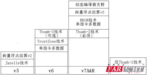 我們可以看到,Cortex系列屬于ARMv7架構,這是ARM公司新的指令集架構,而我們比較熟悉的三星的S3C2410芯片是ARMv4架構,ATMEL公司的AT91SAM9261芯片則是ARMv5架構。 ARMv7架構是在ARMv6架構的基礎上誕生的。該架構采用了Thumb-2技術,Thumb-2技術是在ARM的Thumb代碼壓縮技術的基礎上發展起來的,并且保持了對現存ARM解決方案的完整的代碼兼容性。Thumb-2技術比純32位代碼少使用 31%的內存,減小了系統開銷。同時能夠提供比已有的基于Thumb技術的解決方案高出38%的性能。ARMv7架構還采用了NEON技術,將DSP和媒體處理能力提高了近4倍,并支持改良的浮點運算,滿足下一代3D圖形、游戲物理應用以及傳統嵌入式控制應用的需求。此外,ARMv7還支持改良的運行環境,以迎合不斷增加的JIT(Just In Time)和DAC(DynamicAdaptive Compilation)技術的使用。另外,ARMv7架構對于早期的ARM處理器軟件也提供很好的兼容性。 ARMv7架構定義了三大分工明確的系列:“A”系列面向尖端的基于虛擬內存的操作系統和用戶應用;“R”系列針對實時系統;“M”系列對微控制器和低成本應用提供優化。下圖為v5至v7架構比較: