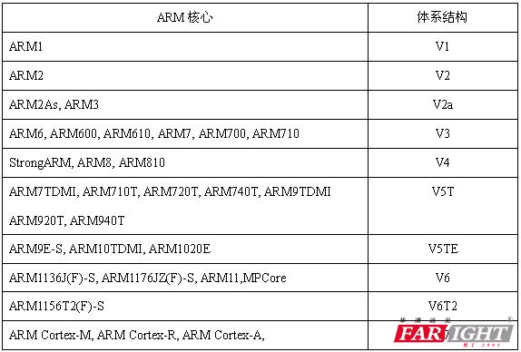 眾所周知,英國的ARM公司是嵌入式微處理器世界當中的佼佼者。ARM一直以來都是自己研發微處理器內核架構,然后將這些架構的知識產權授權給各個芯片廠商,精簡的CPU架構,高效的處理能力以及成功的商業模式讓ARM公司獲得了巨大的成功,使他迅速占據了32位嵌入式微處理器的大部分市場份額,甚至現在,ARM芯片在上網本市場的也大有與INTEL的ATOM處理器一較高低的實力。 目前,隨著對嵌入式系統的要求越來越高,作為其核心的嵌入式微處理器的綜合性能也受到日益嚴峻的考驗,典型的例子就是伴隨3G網絡的推廣,對手機的本地處理能力要求很高,現在一個高端的智能手機的處理能力幾乎可以和幾年前的筆記本電腦相當。為了迎合市場的需求,ARM公司也在加緊研發他們新的ARM架構,Cortex系列就是這樣的產品。在Cortex之前,ARM核都是以ARM為前綴命名的,從ARM1一直到ARM11,之后就是Cortex系列了。Cortex在英語中有大腦皮層的意思,而大腦皮層正是人腦核心的部分,估計ARM公司如此命名正有此含義吧。 一.ARMv7架構特點 下表列出了ARM微處理器核心以及體系結構的發展歷史: