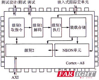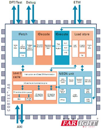 由于應用領域不同,基于v7架構的Cortex處理器系列所采用的技術也不相同,基于v7A的稱為Cortex-A系列,基于v7R的稱為Cortex-R系列,基于v7M的稱為Cortex-M系列。下面一一介紹。 二.Cortex-A8 Cortex-A8第一款基于ARMv7構架的應用處理器。Cortex-A8是ARM公司有史以來性能強勁的一款處理器,主頻為600MHz到1GHz。A8可以滿足各種移動設備的需求,其功耗低于300毫瓦,而性能卻高達2000MIPS。 Cortex-A8也是ARM公司第一款超級標量處理器。在該處理器的設計當中,采用了新的技術以提高代碼效率和性能,采用了專門針對多媒體和信號處理的NEON技術。同時,還采用了Jazelle RCT技術,可以支持JAVA程序的預編譯與實時編譯。 針對Cortex-A8,ARM公司專門提供了新的函數庫(Artisan Advantage-CE)。新的庫函數可以有效的提高異常處理的速度并降低功耗。同時,新的庫函數還提供了高級內存泄漏控制機制。 Cortex-A8處理器使用了先進的分支預測技術,并且具有專用的NEON整型和浮點型流水線進行媒體和信號處理。在使用小于4 mm2的硅片及低功耗的65 nm工藝的情況下,Cortex-A8處理器的運行頻率將高于600MHz(不包括NEON追蹤技術和二級高速緩沖存儲器)。在高性能的90 nm和65 nm工藝下,Cortex-A8處理器運行頻率高可達1 GHz,能夠滿足高性能消費產品設計的需要。 Cortex-A8第一次為低費用、高容量的產品帶來了臺式機級別的性能。當前新的IPHONE手機和ANDROID手機里的處理器就是基于Cortex-A8內核的芯片。 Cortex-A8的系統框圖如下: