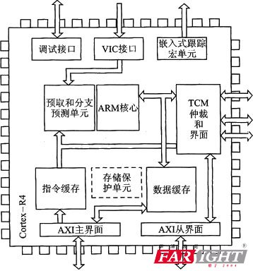 三.Cortex-R4 Cortex-R4是ARM開發的超標量結構的ARM內核,主要面向實時控制領域,如汽車剎車控制等,這一領域要求處理器響應中斷的實時性高,并且要盡可能的節約成本,而很多客戶要求不需過多提高工作頻率,就能提高運算性能,因此在Cortex-R4的設計過程中,工作頻率的佳點位是300MHz。再高的話,不僅需要高速內存,而且時鐘樹的設計也更為復雜。結果,判斷合理的做法就是采用超標量結構,增加單位周期所執行的指令平均數。Cortex-R4單位工作頻率的運算性能為 1.62MIPS(按Dhrystone換算)/MHz,比ARM9的約1.2MIPS/MHz大幅提高。Cortex-R4電路規模只是比ARM9略有增加,但是可以實現更接近于Cortex-A8的運算性能。 Cortex-R4系統框圖如下所示: