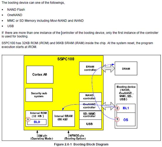 S5PC100有32K ROM(iROM),96K SRAM(IRAM),復位后,程序在iROM運行。Bootloader分為2個階段BL0和BL1。