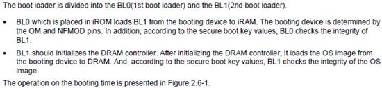 BL0程序在iROM中,三星保密。功能:從啟動設備(比如nand flash)加載BL1(u-boot的前16K)到iRAM。