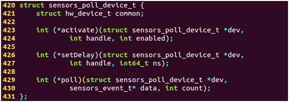 Sensor設備結構體sensors_poll_device_t,對標準硬件設備hw_device_t結構體的擴展,主要完成讀取底層數據,并將數據存儲在struct sensors_poll_device_t結構體中,poll函數用來獲取底層數據,調用時將被阻塞定義如下: