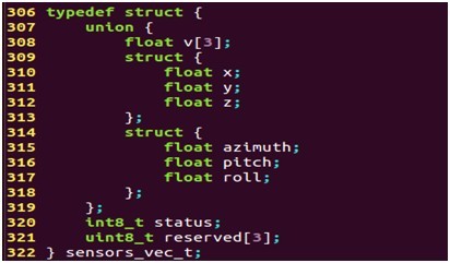 其中,sensor為傳感器的標志符,而不同的傳感器則采用union方式來表示,sensors_vec_t結構體用來表示不同傳感器的數據,sensors_vec_t定義如下: