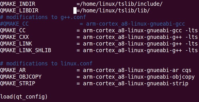 $ vi mkspecs/qws/linux-arm-gnueabi-g++/qmake.conf