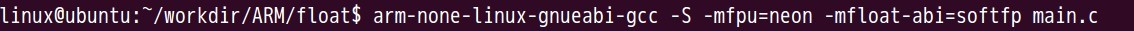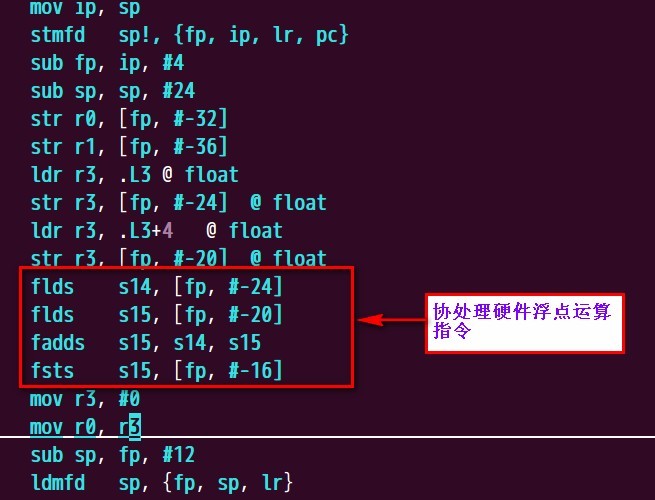 從圖中我們可以知道,默認(rèn)情況下,編譯器使用的是軟浮點(diǎn),圖中__aeabi_fadd這個(gè)函數(shù)是在浮點(diǎn)庫(kù)中實(shí)現(xiàn)。如果想讓代碼能正常的運(yùn)行,還需要在連接的時(shí)候靜態(tài)連接一下浮點(diǎn)庫(kù)。 在這里我們以一個(gè)完成的案例來(lái)說(shuō)明一下,軟浮點(diǎn)庫(kù)的使用方法。 start.S: 使用硬件浮點(diǎn)實(shí)現(xiàn)浮點(diǎn)運(yùn)算(hard-float) 使用硬件浮點(diǎn)的時(shí)候,我們需要給編譯器傳遞一些參數(shù),讓編譯器編譯出硬件浮點(diǎn)單元處理器能識(shí)別的指令。 (1)-mfpu=name 參數(shù)-mfpu就是用來(lái)指定要產(chǎn)生那種硬件浮點(diǎn)運(yùn)算指令,常用的右vfp和neon等。 浮點(diǎn)協(xié)處理器指令: ARM10 and ARM9: (2) -mfloat-abi=value -mfloat-abi=soft 使用這個(gè)參數(shù)時(shí),其將調(diào)用軟浮點(diǎn)庫(kù)(softfloat lib)來(lái)支持對(duì)浮點(diǎn)的運(yùn)算,GCC編譯器已經(jīng)有這個(gè)庫(kù)了,一般在libgcc里面。這時(shí)根本不會(huì)使用任何浮點(diǎn)指令,而是采用常用的指令來(lái)模擬浮點(diǎn)運(yùn)算。但使用的ARM芯片不支持硬浮點(diǎn)時(shí),可以考慮使用這個(gè)參數(shù)。在使用這個(gè)參數(shù)時(shí),連接時(shí)一般會(huì)出現(xiàn)下面的提示: undefined reference to `__aeabi_fdiv' 或者類似的提示,主要因?yàn)橐话闱闆r下連接器沒(méi)有去主動(dòng)尋找軟浮點(diǎn)庫(kù),這時(shí)使用將libgcc庫(kù)加入即可。 -mfloat-abi=softfp -mfloat-abi=hard 這兩個(gè)參數(shù)都用來(lái)產(chǎn)生硬浮點(diǎn)指令,至于產(chǎn)生哪里類型的硬浮點(diǎn)指令,需要由 -mfpu=xxx參數(shù)來(lái)指令。這兩個(gè)參數(shù)不同的地方是: -mfloat-abi=softfp生成的代碼采用兼容軟浮點(diǎn)調(diào)用接口(即使用-mfloat-abi=soft時(shí)的調(diào)用接口),這樣帶來(lái)的好處是:兼容性和靈活性。庫(kù)可以采用-mfloat-abi=soft編譯,而關(guān)鍵的應(yīng)用程序可以采用-mfloat-abi=softfp來(lái)編譯。特別是在庫(kù)由第三方發(fā)布的情況下。 -mfloat-abi=hard生成的代碼采用硬浮點(diǎn)(FPU)調(diào)用接口。這樣要求所有庫(kù)和應(yīng)用程序必須采用這同一個(gè)參數(shù)來(lái)編譯,否則連接時(shí)會(huì)出現(xiàn)接口不兼容錯(cuò)誤。 我們對(duì)main.c文件使用硬件浮點(diǎn)重新編譯: