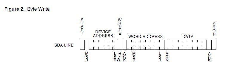 對EEPROM 按字節寫的操作順序,先由主設備發送一個start起始信號,發一個字節的設備地址(7 + 1 位 ,寫),第9位為ACK應答位,發一字節的地址(表示要往哪個地址空間寫數據,一共256個字節地址),接著傳送一字節的數據。發一個ACK信號,發送停止信號stop。多存放256字節的數據